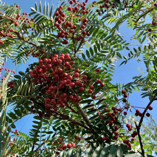 Prepare to be captivated by its very pretty feathery foliage adorned with numerous olive green leaflets, which transform into a mesmerizing dark crimson during autumn. In April to May, creamy white flowers emerge, enchanting the surroundings. Following the bloom, pendulous clusters of berries make their appearance, transitioning from a vibrant red to a delicate white hue as the season progresses. The berries continue to grace the tree well into winter. It’s a perfect choice for smaller gardens with a mature spread of 5m and height of 5m.